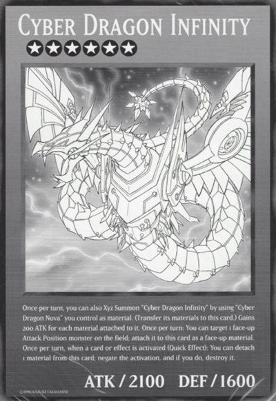 Once per turn, you can also Xyz Summon "Cyber Dragon Infinity" by using "Cyber Dragon Nova" you control as material. (Transfer its materials to this card.) Gains 200 ATK for each material attached to it. Once per turn: You can target 1 face-up Attack Position monster on the field; attach it to this card as material. Once per turn, when a card or effect is activated (Quick Effect): You can detach 1 material from this card; negate the activation, and if you do, destroy it.