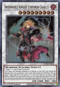 If an Equip Card becomes equipped to a monster on the field, even during the Damage Step: You can destroy 1 card on the field. During the End Phase: You can equip 1 Equip Spell from your hand or GY to this card, then you can equip 1 FIRE Warrior monster from your Deck to this card as an Equip Spell that gives it 500 ATK. You can only use each effect of "Infernoble Knight Emperor Charles" once per turn.